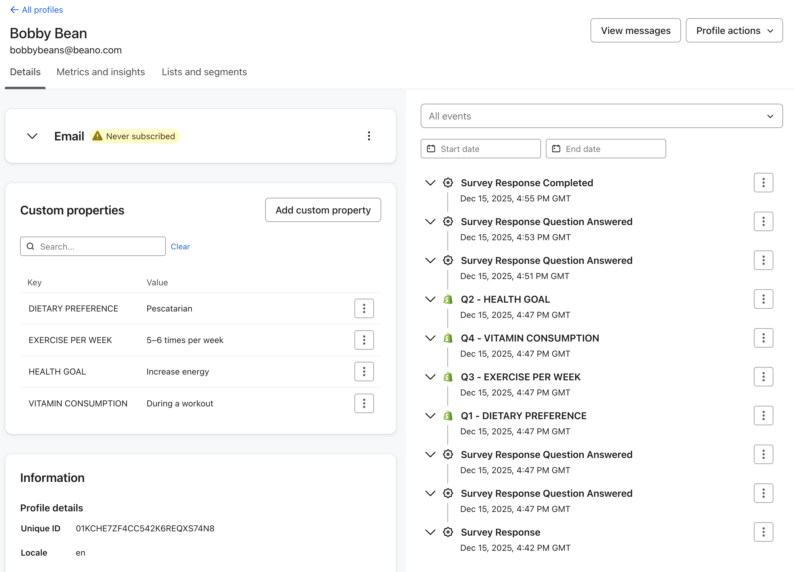 Once your survey and Flow are set up, submit a test response to trigger the workflow. Then head to the customer profile in Klaviyo to confirm that each survey answer has been added as a profile property. From there, the data is ready to use for segmentation, personalisation, and automation.